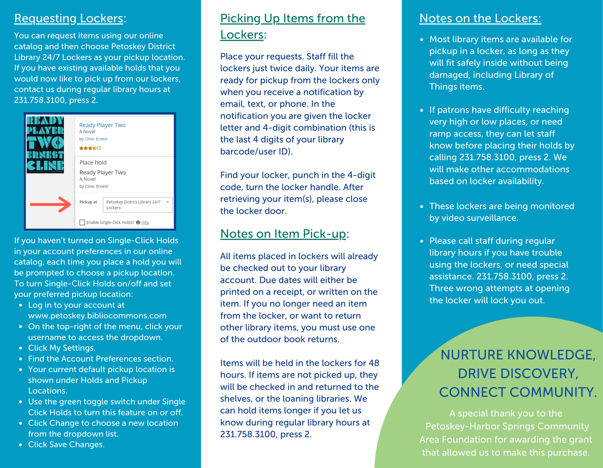 When you find what you want in our catalog, select “Petoskey District Library 24/7 Lockers” as your pickup location. Our 24/7 Locker handout includes detailed instructions for placing locker holds.